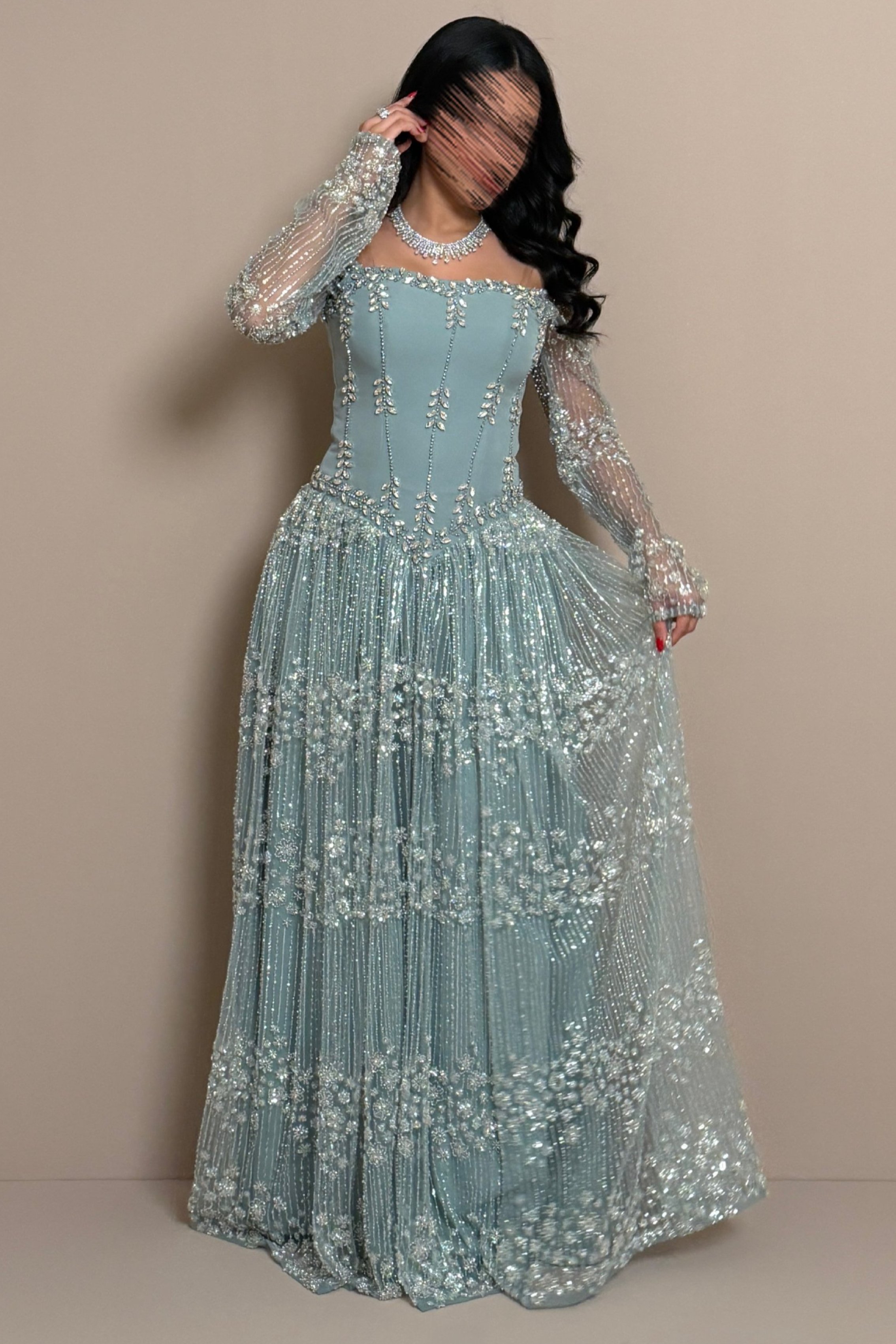 فستان بتصميم فاخر يبرز الأنوثة بأسلوب راقٍ، يتميز بقصّة أنيقة ناعمة تعطي توازنًا جميلًا للقوام مع تفاصيل تطريز لامعة موزعة بانسجام تضيف لمسة فخمة بدون مبالغة. التصميم يمنح حضورًا مميزًا وإطلالة راقية تناسب الذوق الكلاسيكي العصري، ويعد خيارًا مثاليًا للمناسبات الخاصة. لون القطعة تيفاني يعكس نعومة وأناقة تلفت الأنظار.
