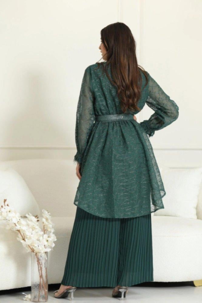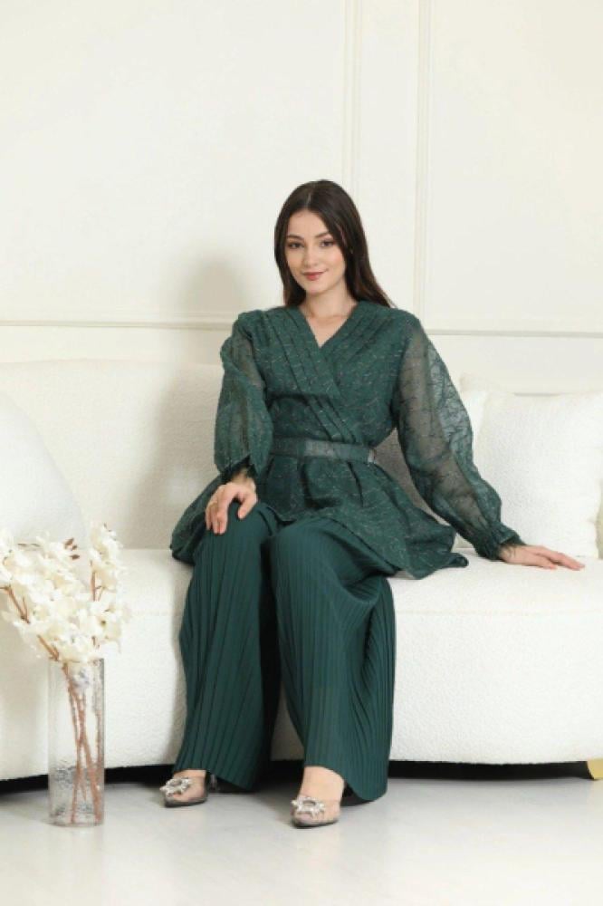 تألقي بإطلالة راقية في مناسباتك الخاصة مع هذا الطقم الأنيق المكون من بلوزة مطرزة بأكمام طويلة وبنطلون بكسرات مريحة، مع حزام كريستالي يضيف لمسة من الفخامة. تصميم يجمع بين الأناقة والراحة في آنٍ واحد.