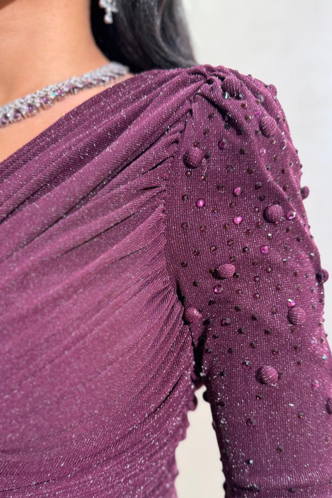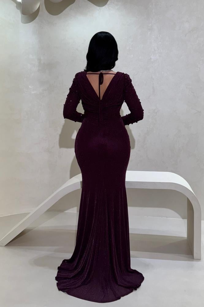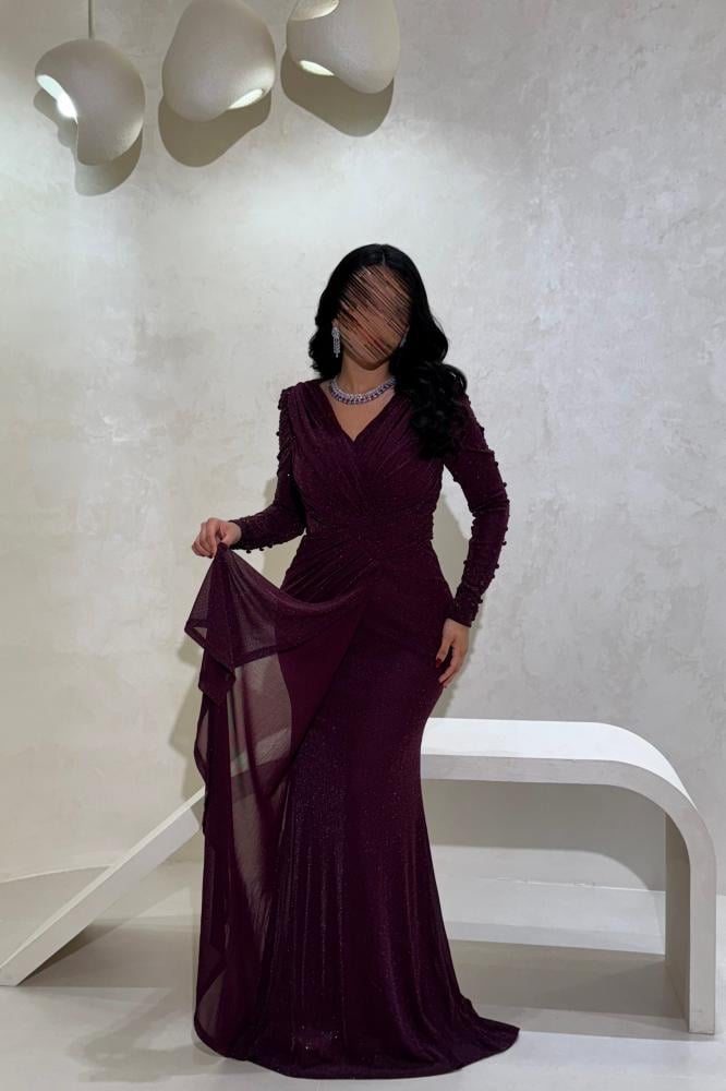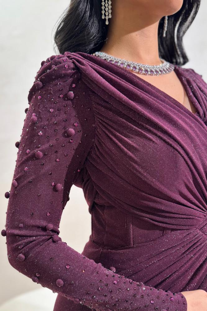فستان سهرة عنّابي بلمعة ناعمة وأكمام مزخرفة