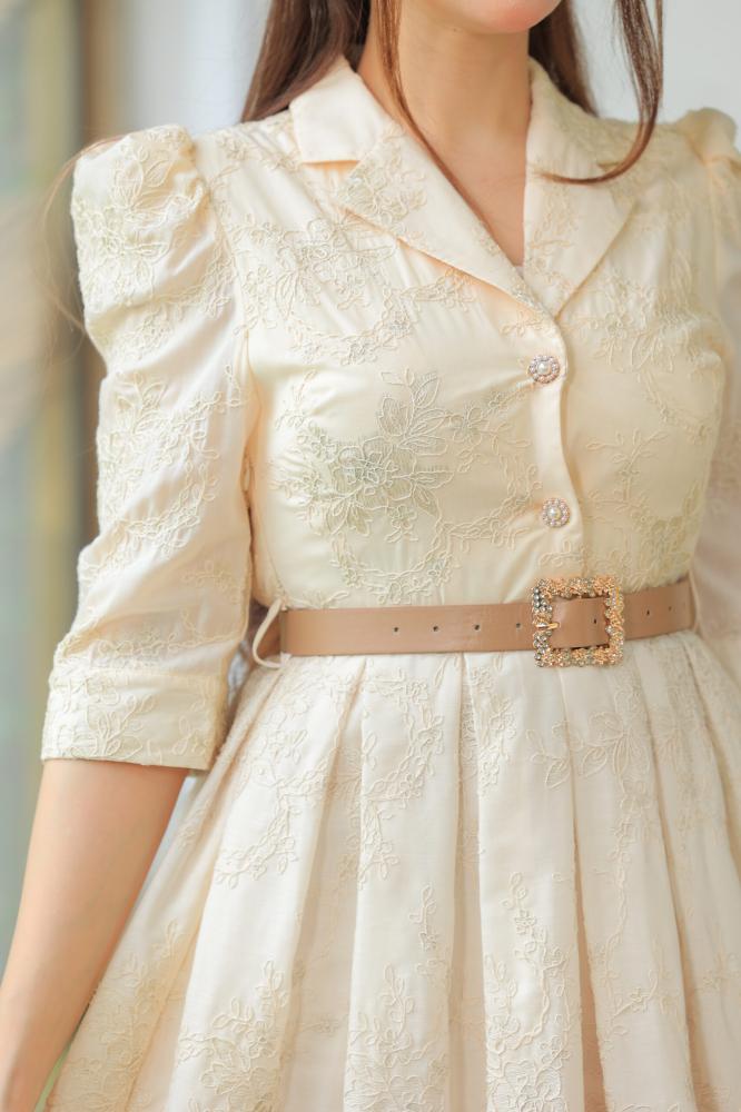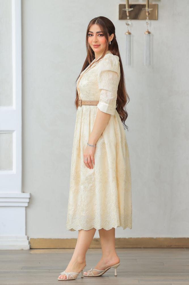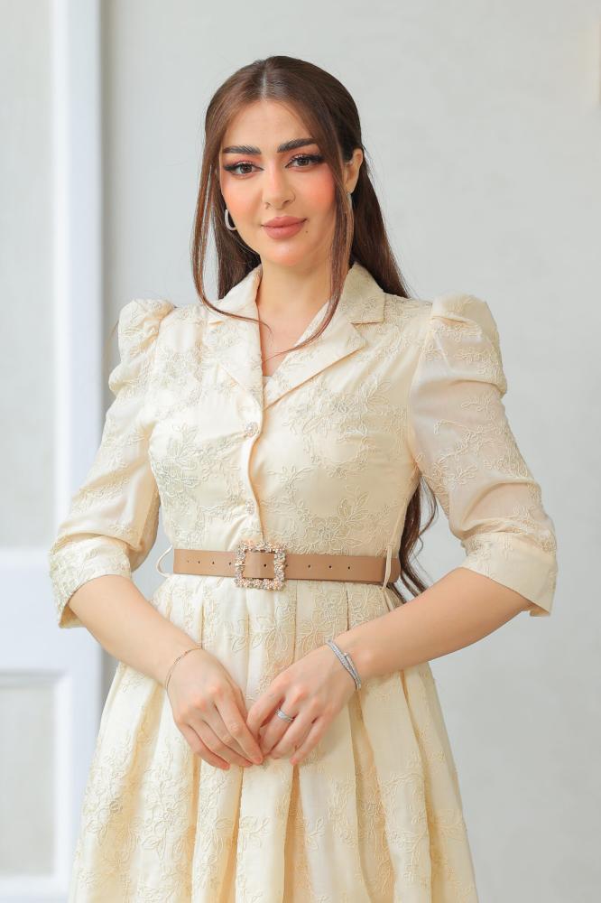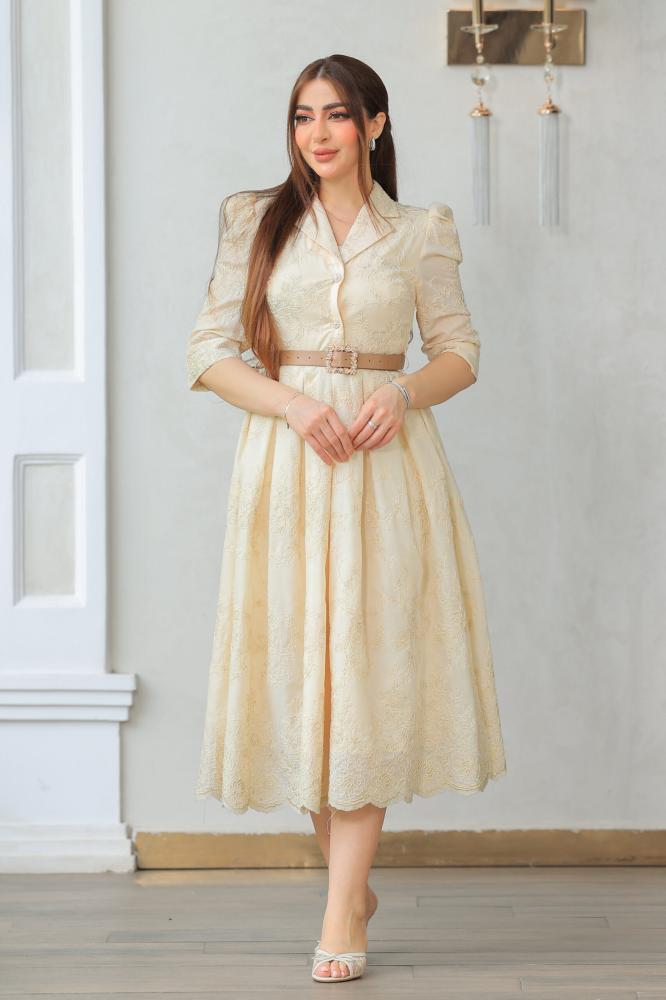 فستان فاخر بتصميم كلاسيكي أنيق بلون بيج غامق، مصنوع من قماش الكريب الفخم بنقشات بارزة تضيف لمسة من الرقي. يتميز بخط عنق على شكل V وأكمام أنيقة بطول متوسط، مع حزام جلد مزين بإبزيم لؤلؤي فاخر لإبراز جمال الخصر. خيار مثالي لإطلالة راقية في الحفلات والمناسبات الرسمية.