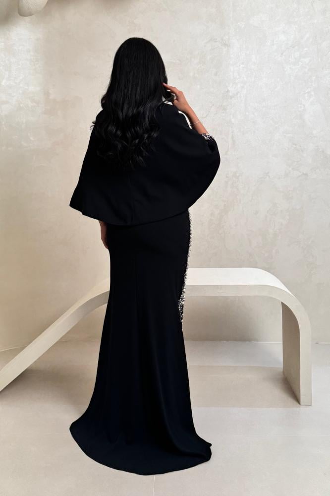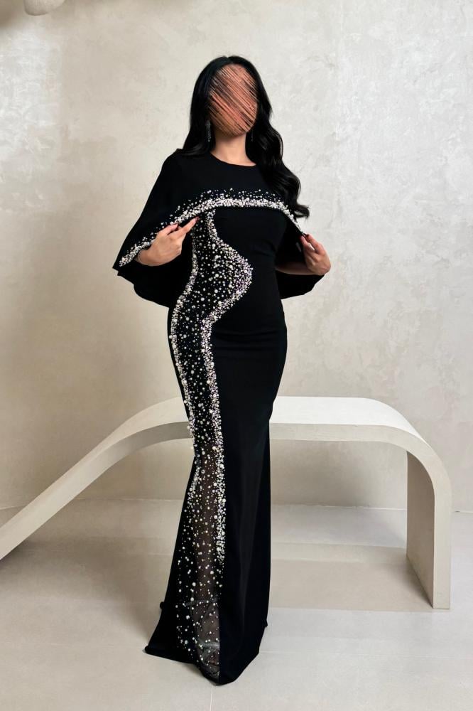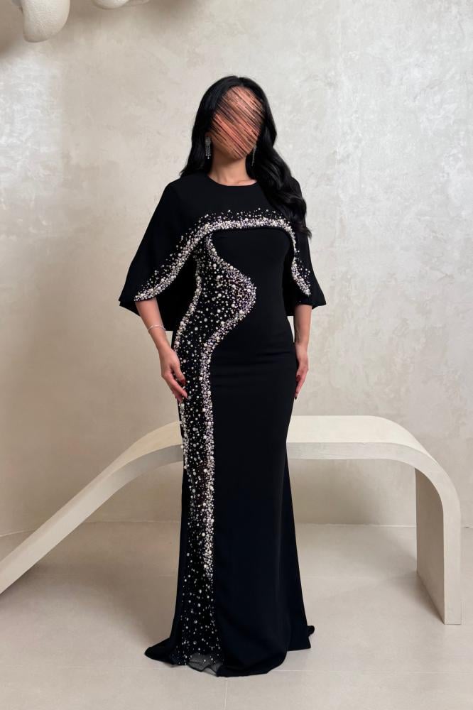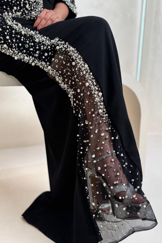 فستان سهرة أسود أنيق بتصميم ضيق يبرز القوام، مزين بخط متعرج من اللؤلؤ والترتر البراق على جانب الفستان مع لمسات شفافة تضيف فخامة راقية.