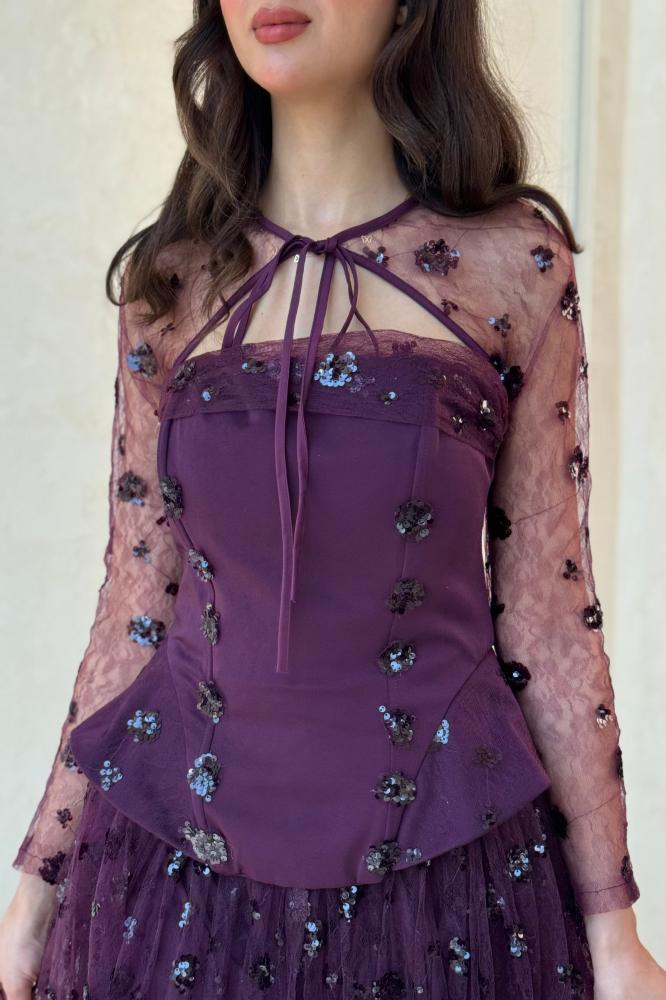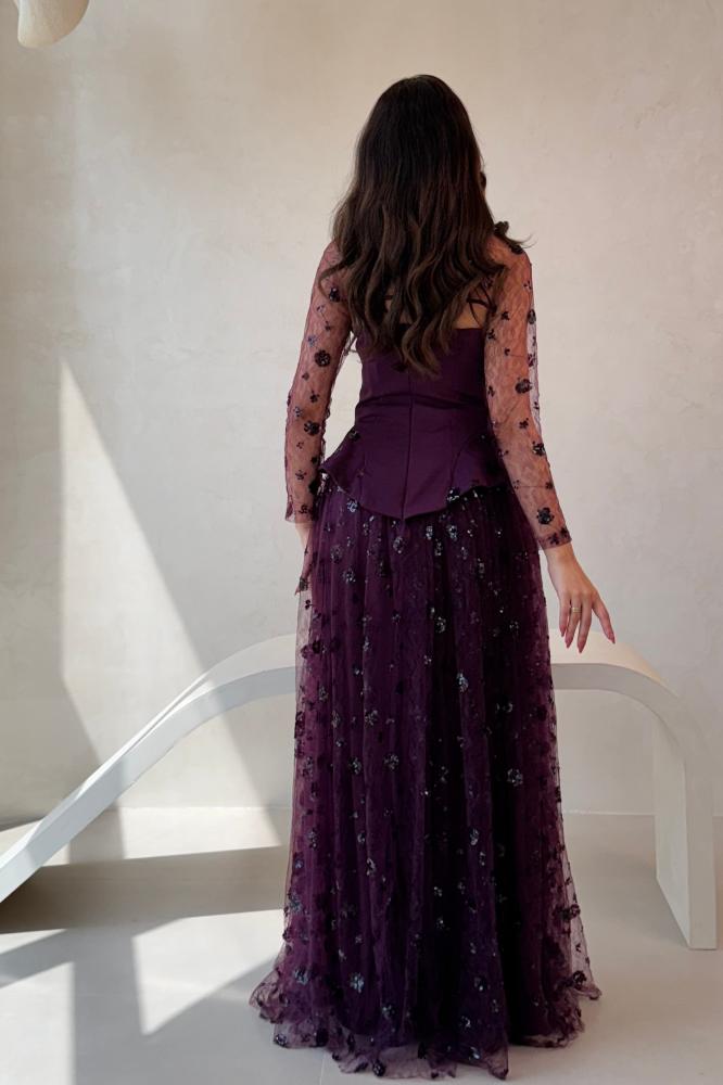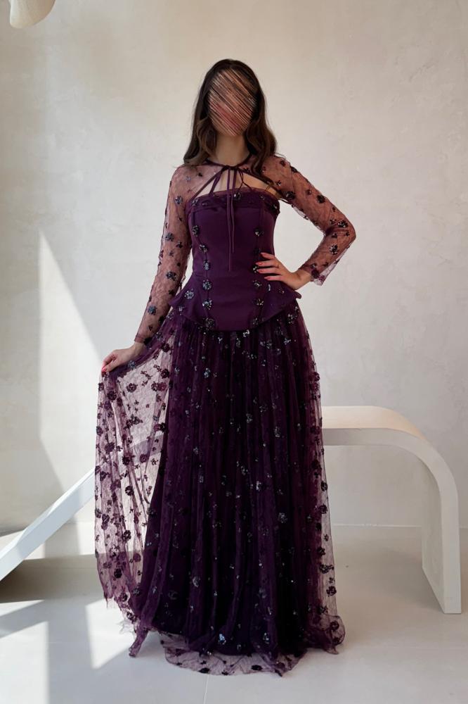 هو فستان سهرة بلون بنفسجي داكن بتصميم ملكي راقٍ , الجزء العلوي مصمم بقصة كورسيه ضيق يحدد الخصر، مع تفاصيل مطرزة بالترتر والورود الصغيرة اللامعة. الأكمام طويلة وشفافة من تول مطرز تضيف لمسة رقيقة وناعمة، مع ربطة أنيقة حول الرقبة تعطيه لمسة كلاسيكية مميزة