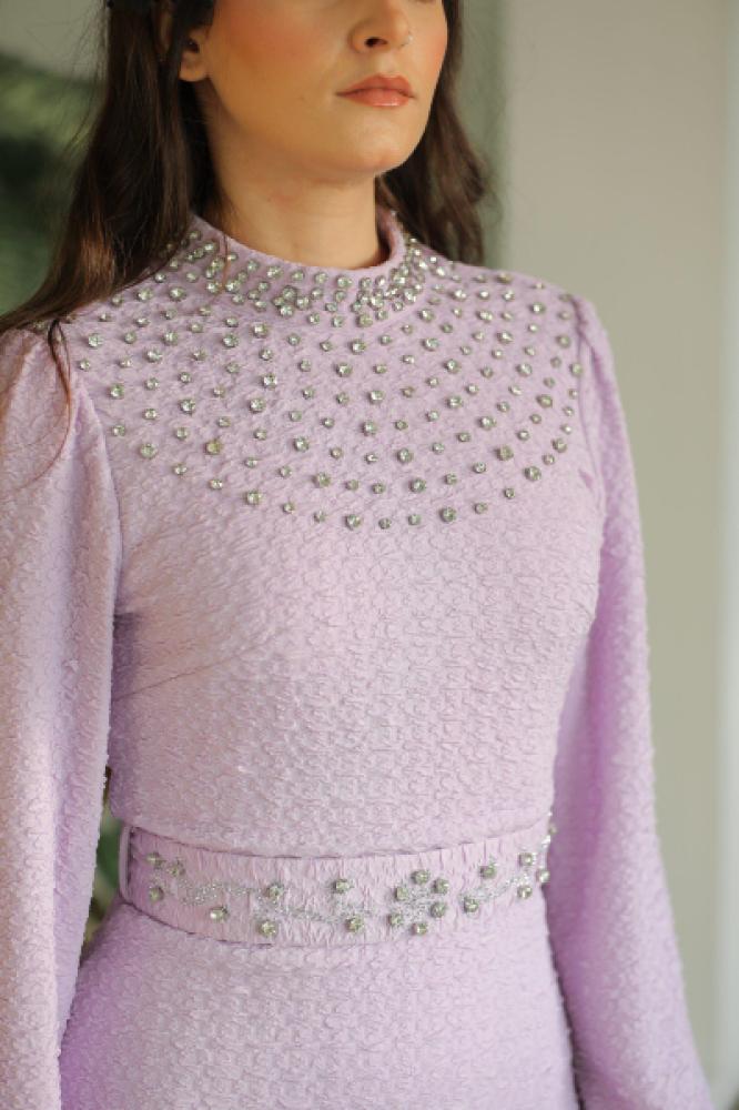 قماش بوليستر ناعم، وياقة خناقي مرصعة بكريستالات فخمة تعطي لمعة ساحرة على الإضاءة، مع حزام بنفس اللون ومزين بتفاصيل كريستالية تكمّل الفخامة.