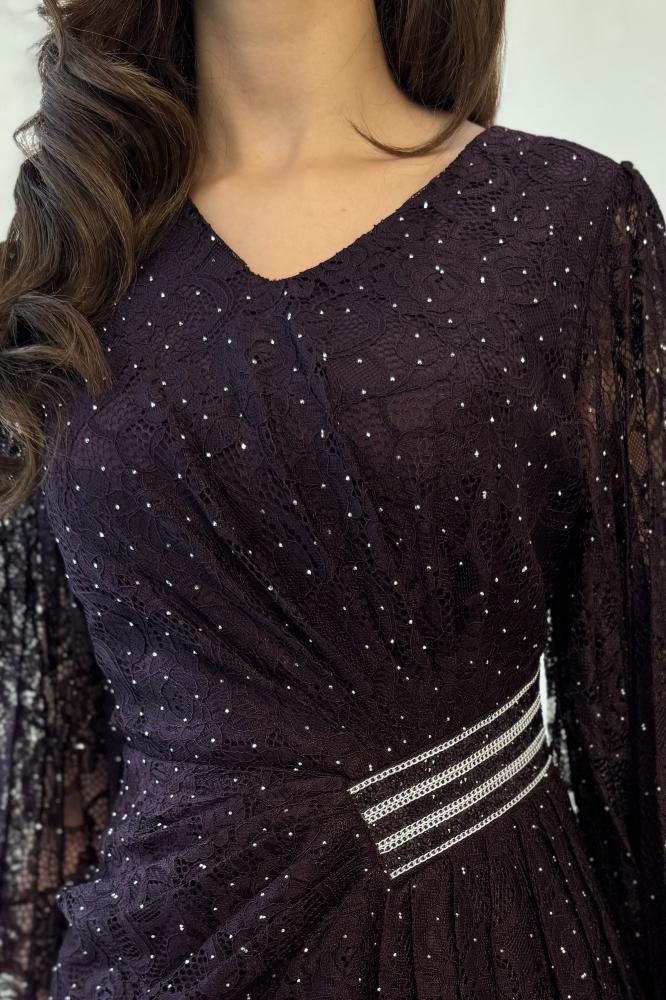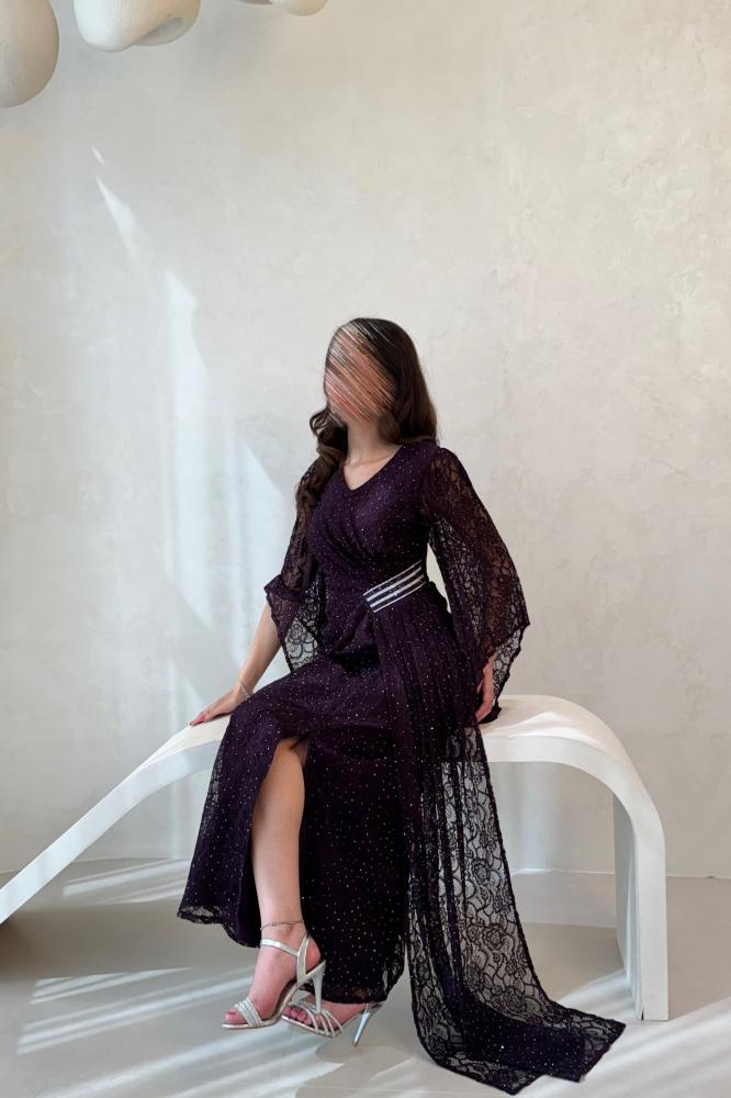فستان بنفسجي غامق بدانتيل وترتر وأكمام واسعة