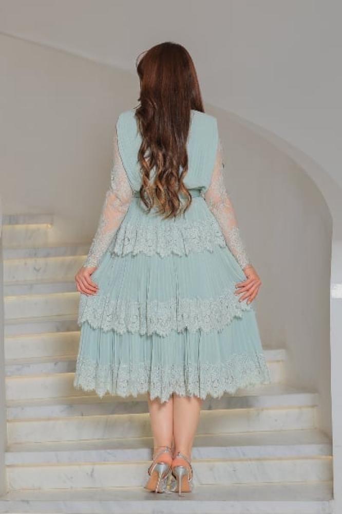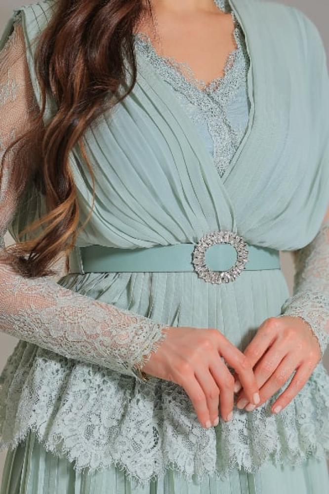فستان فاخر بتصميم أنثوي ناعم يعكس مزيجًا من الرقي والنعومة، يتميز بقماش الدانتيل والشيفون الراقي مع تفاصيل مطوية أنيقة ولمسات دانتيل على الأطراف. يأتي بياقة على شكل V وأكمام طويلة تضيف لمسة كلاسيكية ساحرة، مع حزام أنيق مزين بإبزيم يبرز جمال الخصر. خيار مثالي لحفلات الخطوبة والزواج والمناسبات الخاصة.