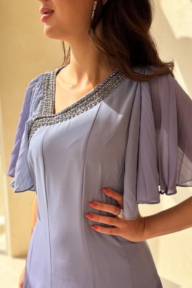 فستان بنفسجي متدرج بأكمام كشكش وتطريز ناعم