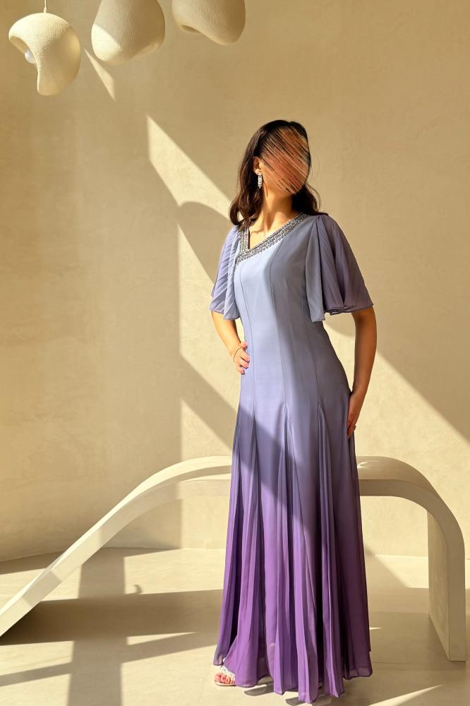 فستان سهرة بتدرجات اللون البنفسجي بتصميم أنثوي ناعم يفيض فخامة وأناقة. يتميز بأكمام كشكش منسدلة تضيف حركة انسيابية رقيقة، مع ياقة مزينة بتطريز لامع يمنح لمسة فاخرة. التصميم المتدرج للألوان يمنح الفستان عمقًا وجاذبية فريدة، وخامته اللامعة تضيف حضورًا راقيًا تحت الإضاءة. خيار مثالي للسهرات والمناسبات الخاصة التي تبحثين فيها عن الأناقة الهادئة والتميّز.
