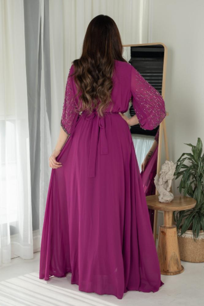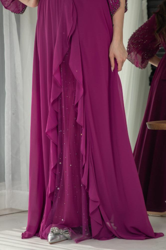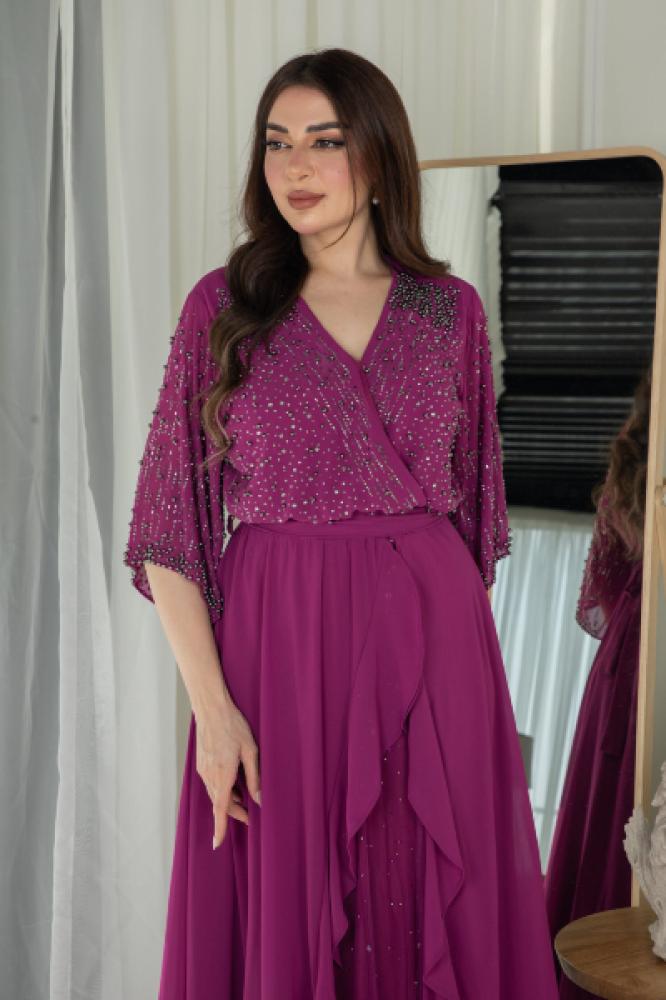 فستان سهرة فاخر بكشكش جانبي أنيق، مطرز بالخرز اللامع على الصدر ليمنحك إطلالة راقية ومميزة. يأتي بتصميم بأكمام واسعة مريحة وقماش شيفون ناعم ينساب برقي، مع حزام قماش يبرز جمال الخصر. خيار مثالي للمناسبات الخاصة وحفلات المساء.