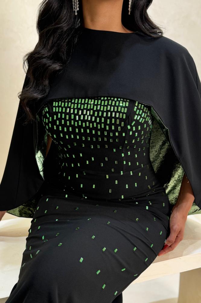 فستان أسود بتفاصيل خضراء لامعة بتصميم فاخر