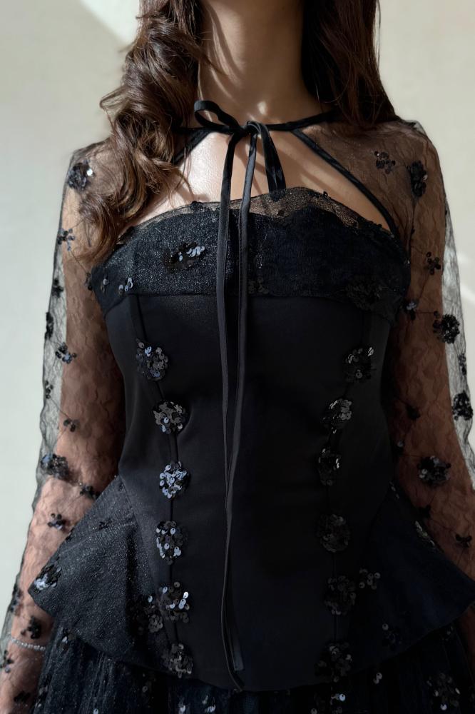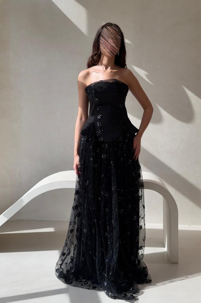 فستان أسود دانتيل بتطريز ناعم وتصميم كورسيه
