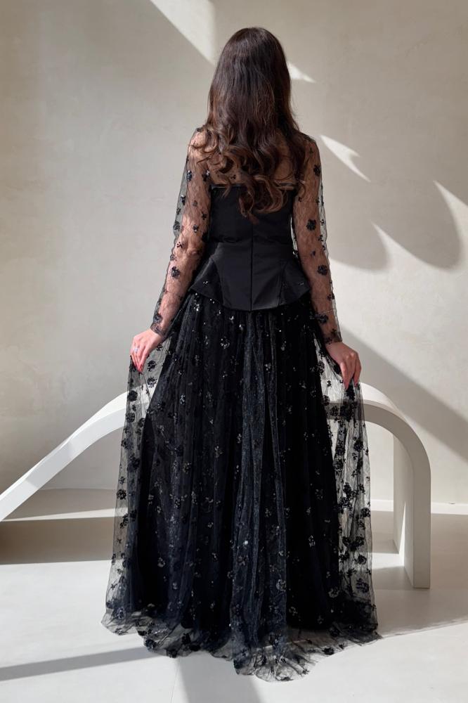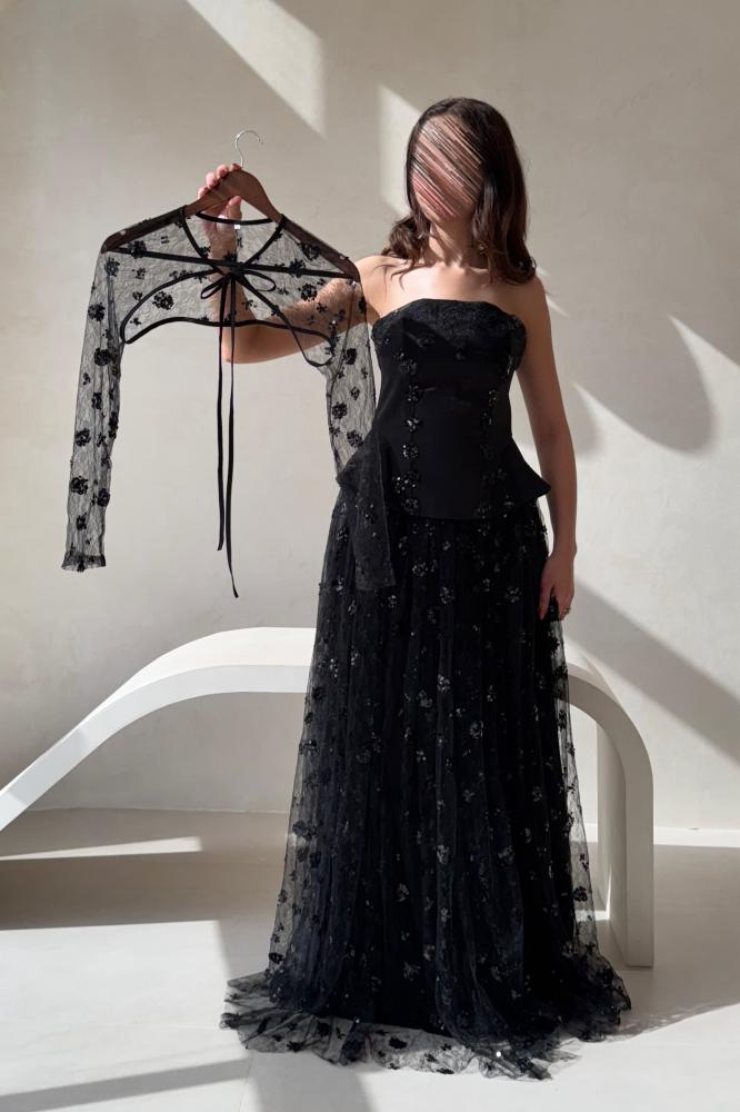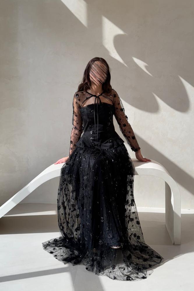 فستان سهرة أسود بتصميم فاخر يجمع بين الجرأة والأنوثة. يتميز بجزء علوي بتصميم كورسيه أنيق يبرز الخصر بأسلوب جذاب، مع أكمام دانتيل شفافة مطرزة بزهور صغيرة تضيف لمسة فنية راقية. تنورته المنسدلة من التول المطرز تمنح الفستان حركة ناعمة وبريقًا فخمًا تحت الإضاءة. خامته فاخرة وتصميمه مثالي للسهرات والمناسبات المميزة التي تتطلب إطلالة تخطف الأنظار.