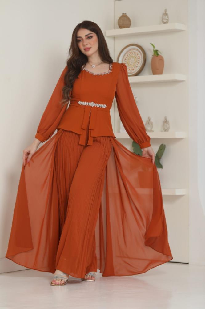تألقي بإطلالة عصرية وراقية مع هذا الطقم المميز المكون من بلوزة بأكمام طويلة وبنطلون واسع بكسرات أنيقة. تم تصميمه بخط عنق دائري مزين بلمسات فاخرة مع حزام يبرز الخصر ليمنحكِ جاذبية وأناقة مثالية للمناسبات الخاصة والخروج المميز.