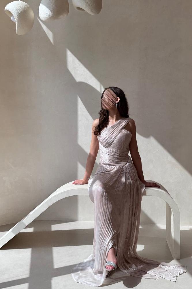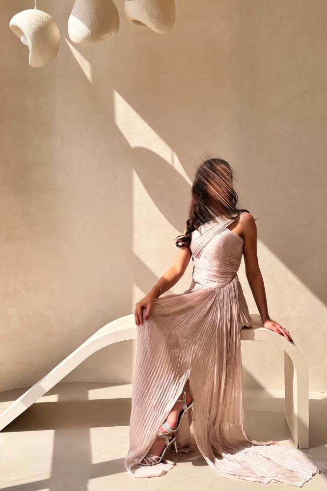 فستان سهرة بلون بيج راقٍ بتصميم يجمع بين البساطة والفخامة. يتميز بقصة كت أنثوية وتفاصيل كسرات انسيابية تلتف حول الجسم بأسلوب ناعم يبرز القوام بأناقة. خامته اللامعة تضيف لمسة فخمة تحت الإضاءة، مع ذيل خفيف يمنح إطلالتك حضورًا ملوكيًا راقيًا. مثالي للسهرات والمناسبات التي تبحثين فيها عن إطلالة تجمع بين النعومة والرقي.