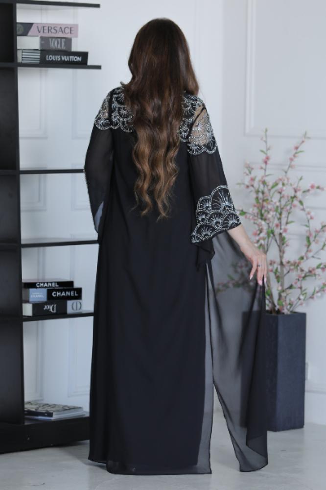 يتميز هذا الفستان الفاخر بتصميم قطعتين يجمع بين الأناقة والفخامة، حيث تأتي الطبقة الخارجية من الشيفون المزخرف بتطريز أنيق على الكتف والأكمام، مع بطانة من قماش الكريب الناعم لتوفير الراحة والانسيابية. تصميمه بقصة أمامية طويلة وخط عنق دائري يمنحك إطلالة راقية مثالية للمناسبات الخاصة.