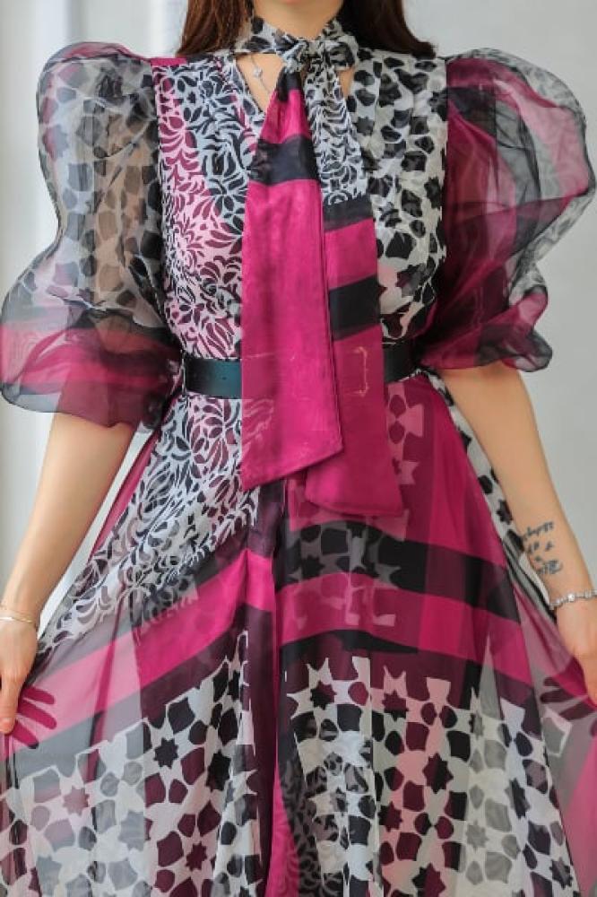 فستان فوشي بنقوش هندسية – جرأة وأناقة بكل تفاصيله