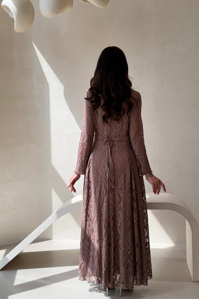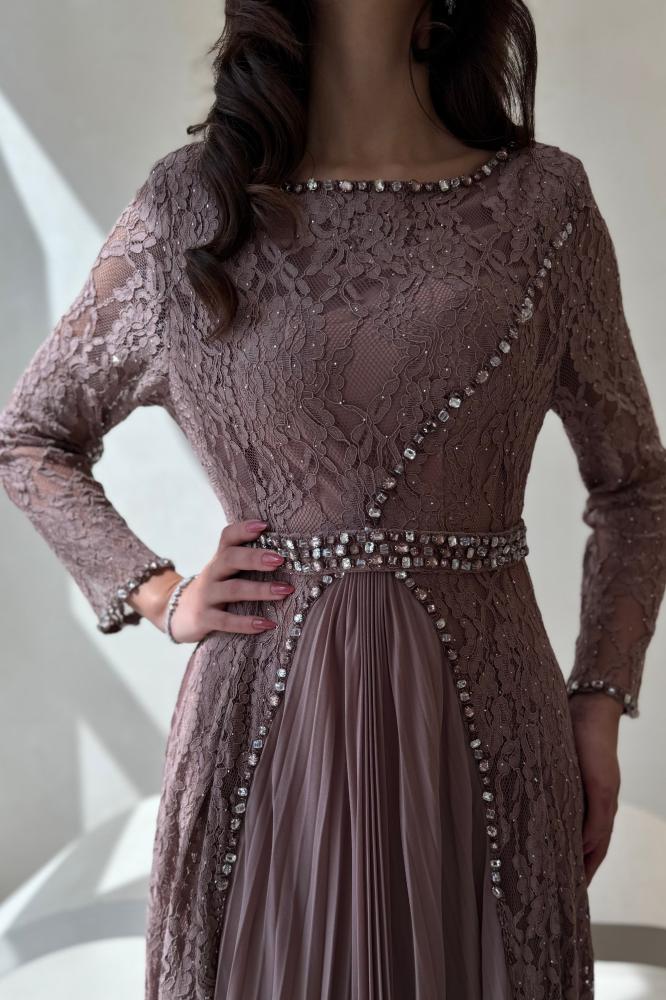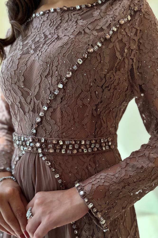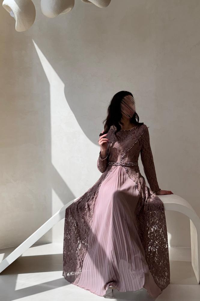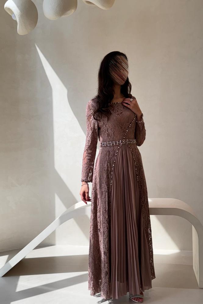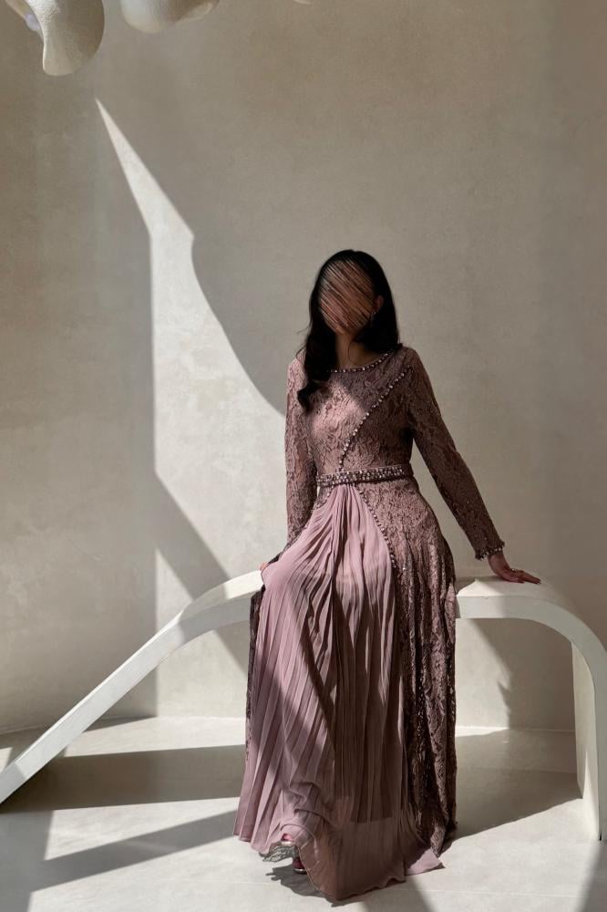 فستان سهرة بلون وردي غامق بتصميم يجمع بين الفخامة والرقة. الجزء العلوي من الدانتيل المطرز يضيف لمسة أنثوية راقية، بينما تمنح الكسرات الحريرية في التنورة انسيابية جميلة تضفي حركة ناعمة على الإطلالة. مزين بحزام مرصع بالكريستال لتحديد الخصر وإبراز القوام بشكل أنيق. خامته فاخرة ومناسبة للسهرات والمناسبات الراقية التي تتطلب حضورًا فخمًا ومميزًا.