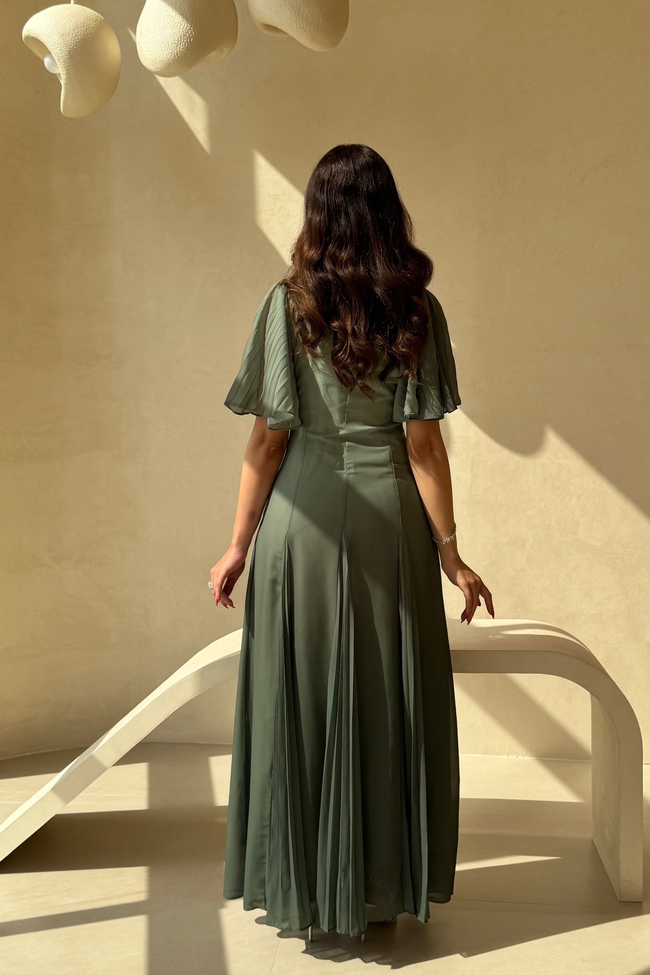 فستان زيتي بأكمام كشكش وتطريز ناعم عند الياقة