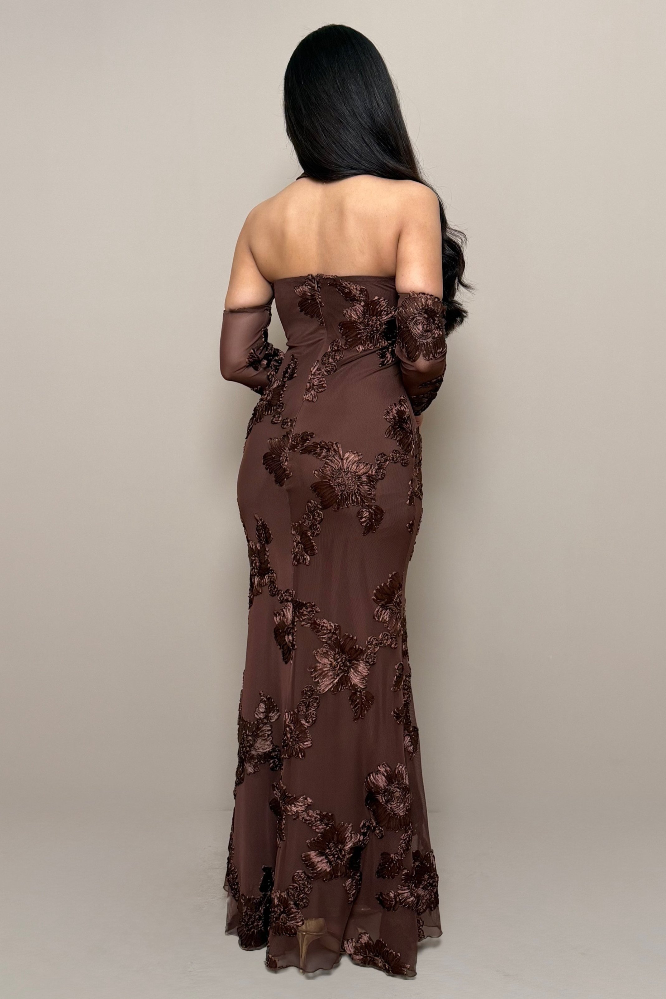 فستان بني بتطريزات بارزة وقصة أنثوي