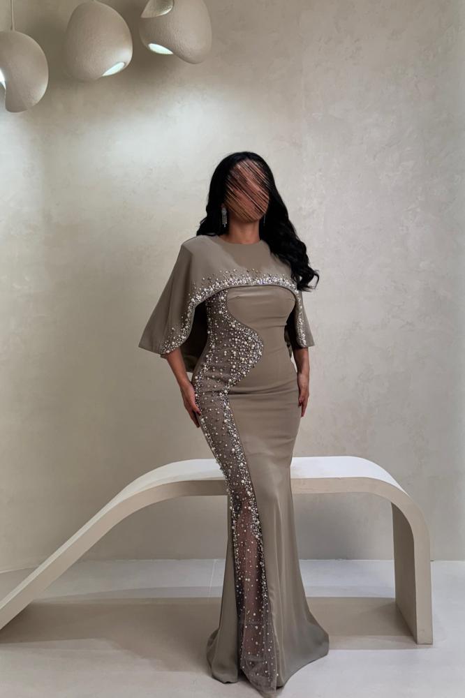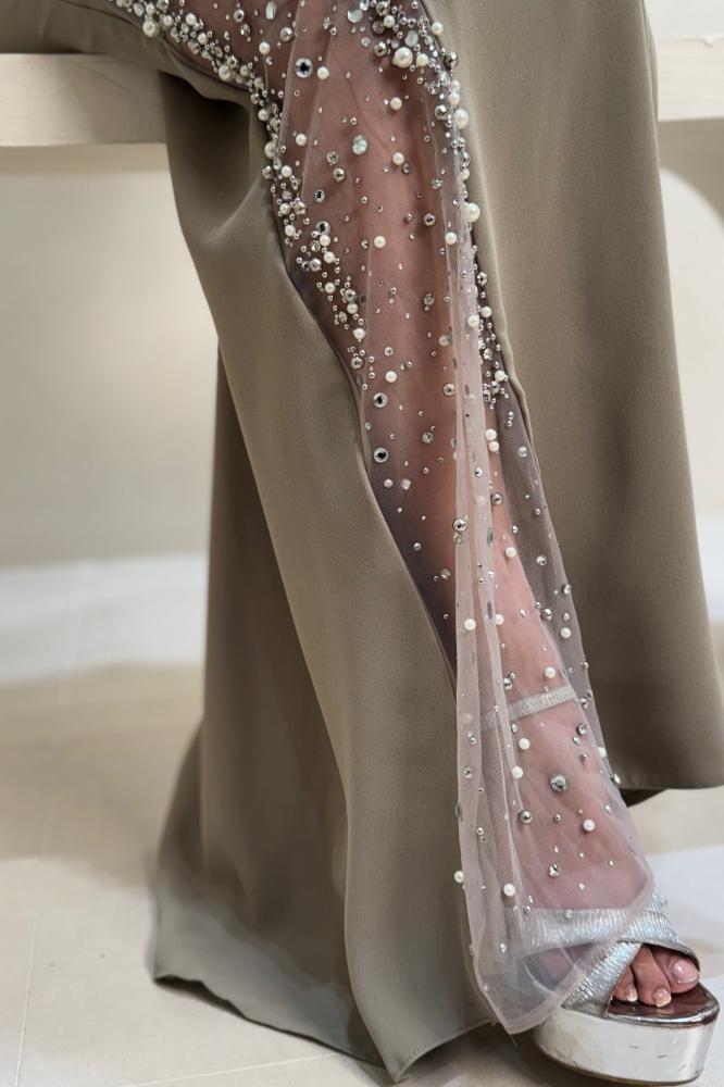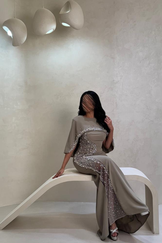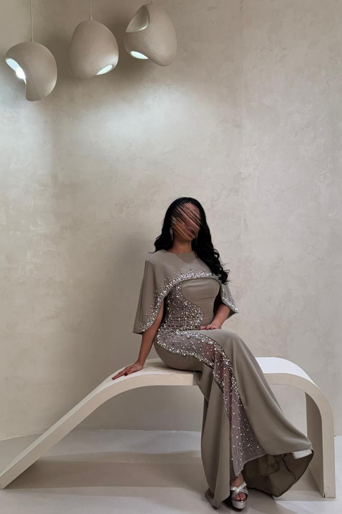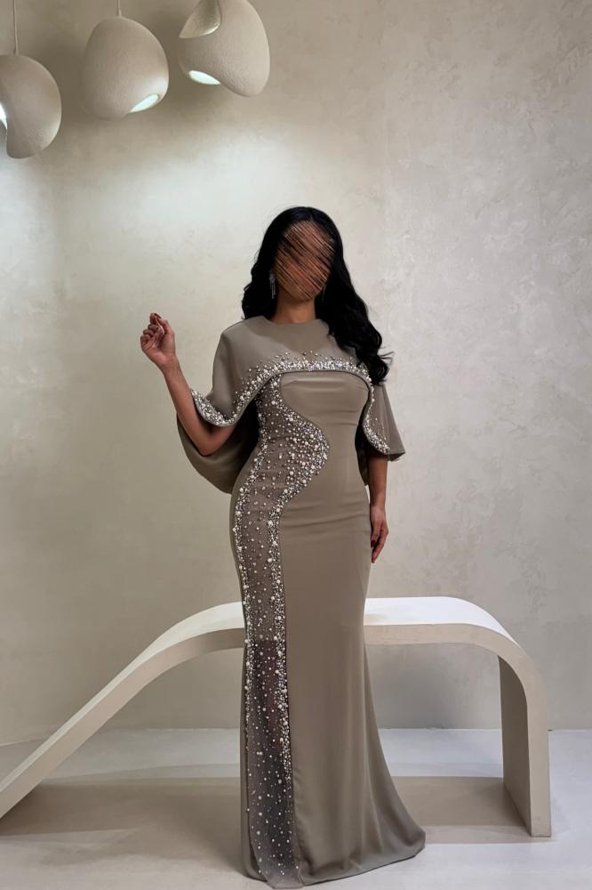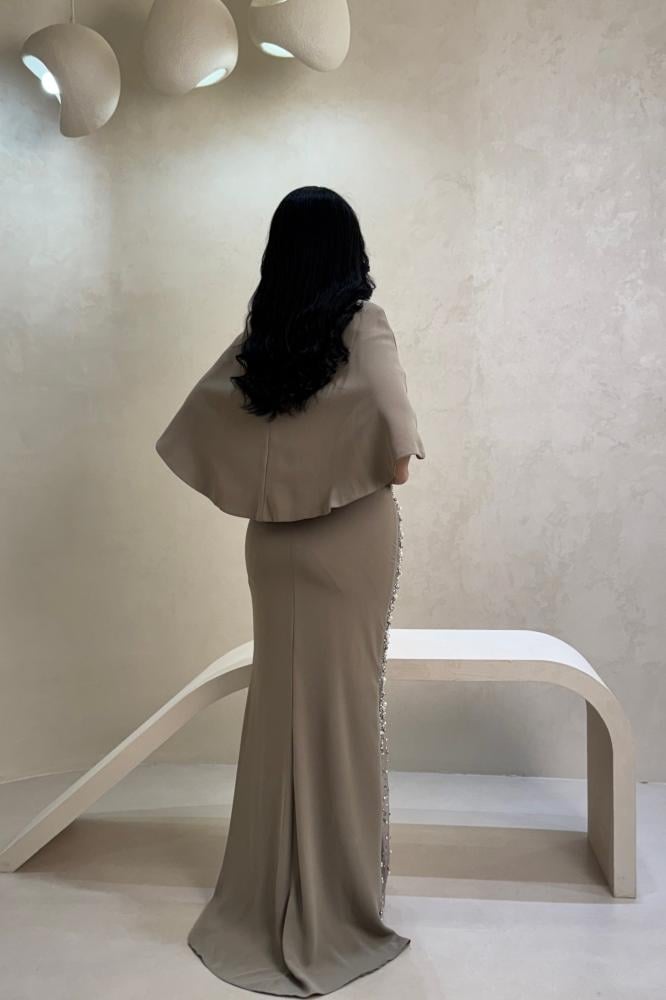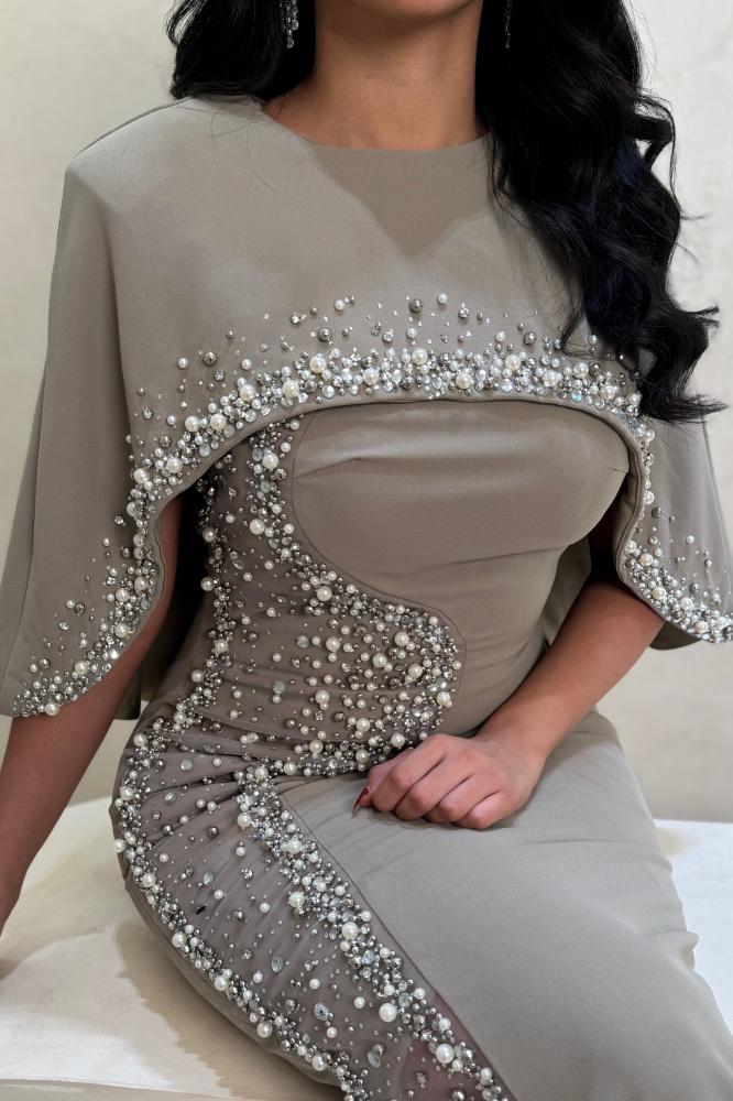 فستان سهرة بلون زيتي فاخر بتصميم أنثوي أنيق مزين بتطريزات فاخرة من اللؤلؤ والكريستال على الجهة الأمامية مع شق جانبي راقٍ يضفي لمسة جذابة. يأتي معه جاكيت قصير بتطريز مماثل يمنحك إطلالة متكاملة تجمع بين الفخامة والنعومة، مثالي للمناسبات الرسمية والسهرات الراقية.