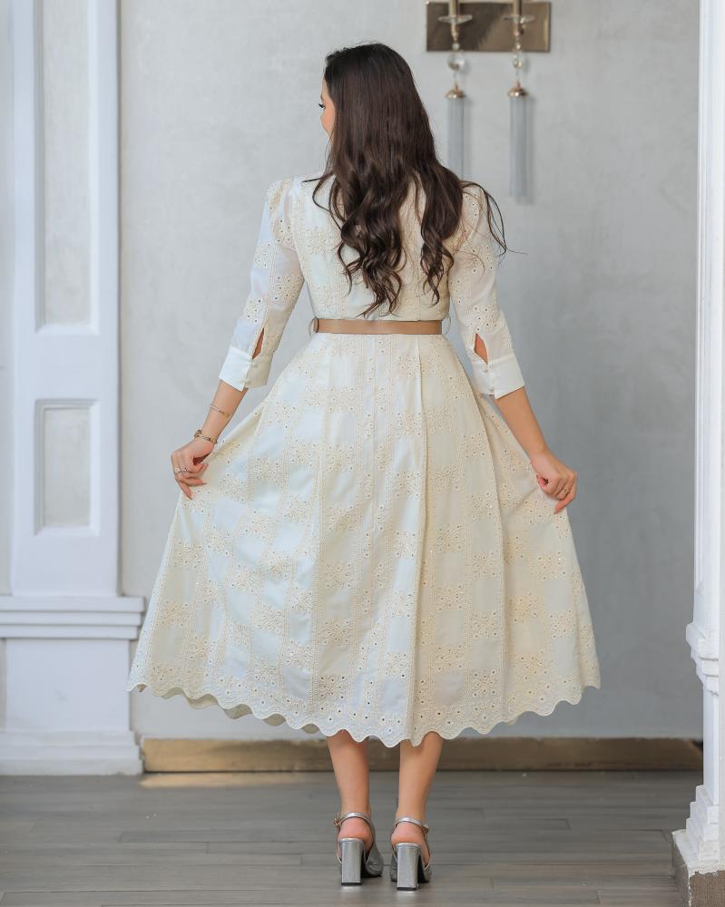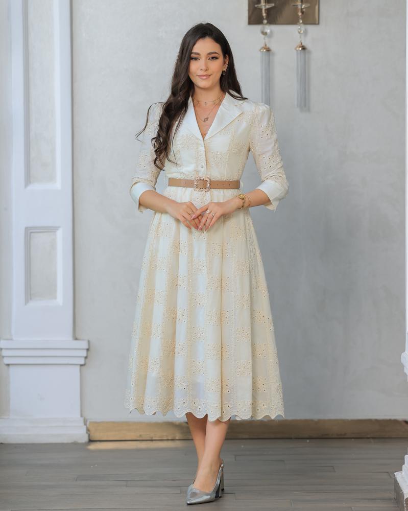 فستان أنيق بطابع كلاسيكي راقٍ، يتميز بتفاصيل أنثوية ناعمة تمنحك إطلالة فخمة ومحتشمة في آن واحد. تصميمه بخط عنق على شكل V مع أكمام طويلة وقماش كريب فاخر يضفي لمسة من الرقي. مثالي للحفلات الرسمية والمناسبات المميزة.