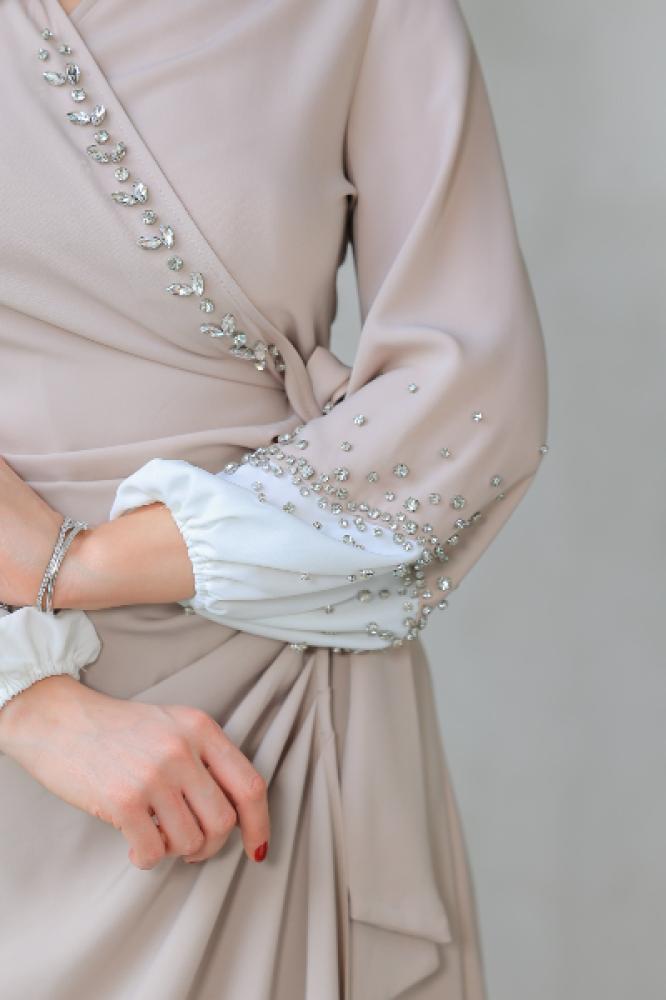 فستان ميدي بنعومة فخمة وقصة لف تبرز جمال الجسم بكل رقي، تصميمه يوازن بين الاحتشام والجاذبية، مع أكمام طويلة بتطريز لؤلؤ ناعم يخطف الأنظار.