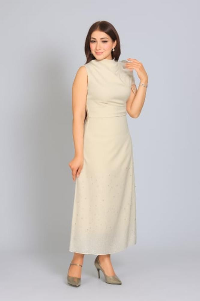 فستان سهرة راقي باللون الكحلي مصنوع من قماش الساتان الناعم بلمعته الفاخرة يتميز بتصميم بلا أكمام وخط عنق دائري أنيق يمنح إطلالة عصرية متوازنة بين البساطة والفخامة يزدان بتفاصيل من الخرز البراق على الجزء السفلي تضفي لمسة لامعة تخطف الأنظار وتزيد من جمال الإطلالة في السهرات والمناسبات الخاصة