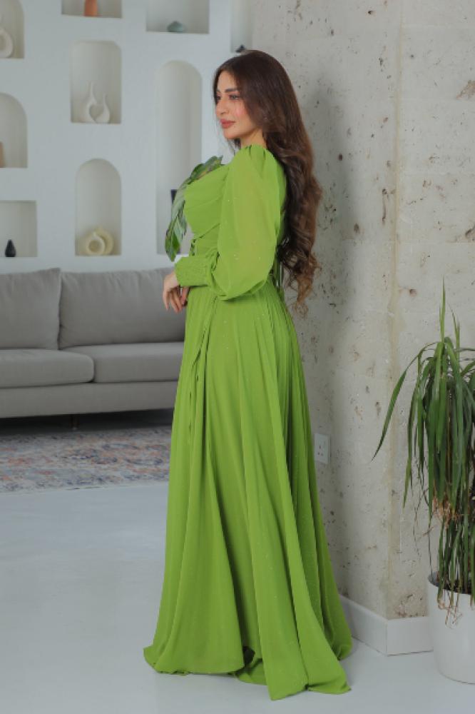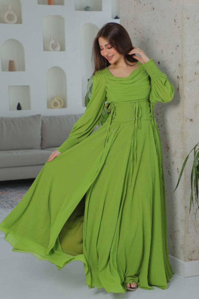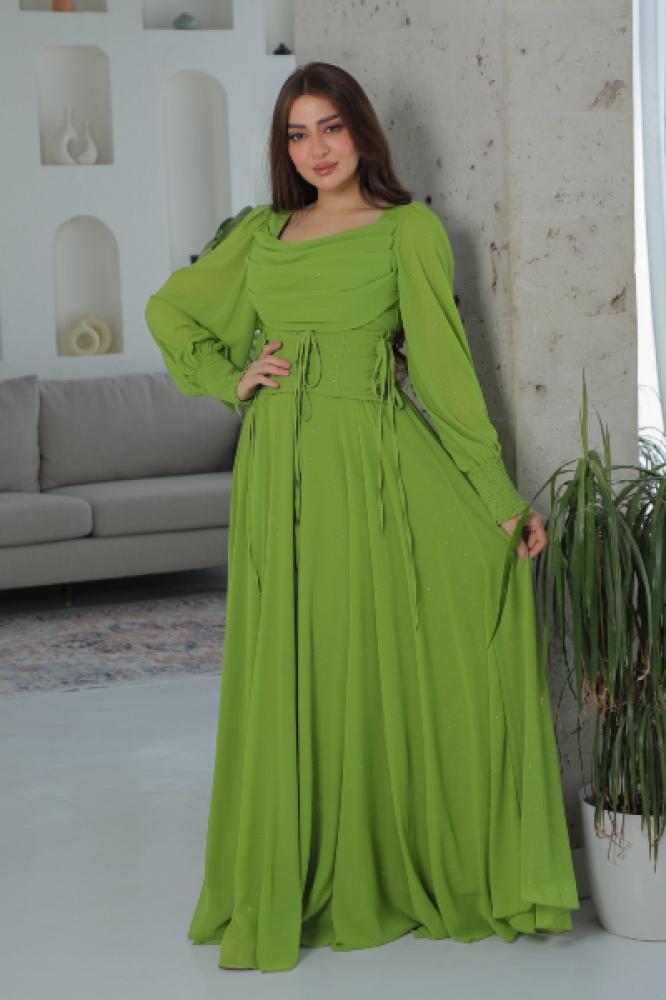 فستان شيفون بلمعة مع حزام كورسيه أنيق بلون عشبي