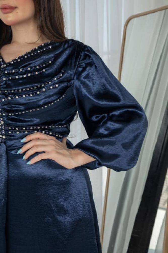 فستان طويل أنيق مزخرف بفصوص ناعمة بتصميم فاخر من قماش البوليستر اللامع، يمنحك إطلالة راقية للمناسبات الخاصة. يتميز بخط عنق على شكل V وأكمام واسعة مريحة تضفي لمسة انسيابية على مظهرك. تصميم الفستان يعكس الأناقة والرقي مع لمسات تطريز ناعمة على الصدر والخصر.