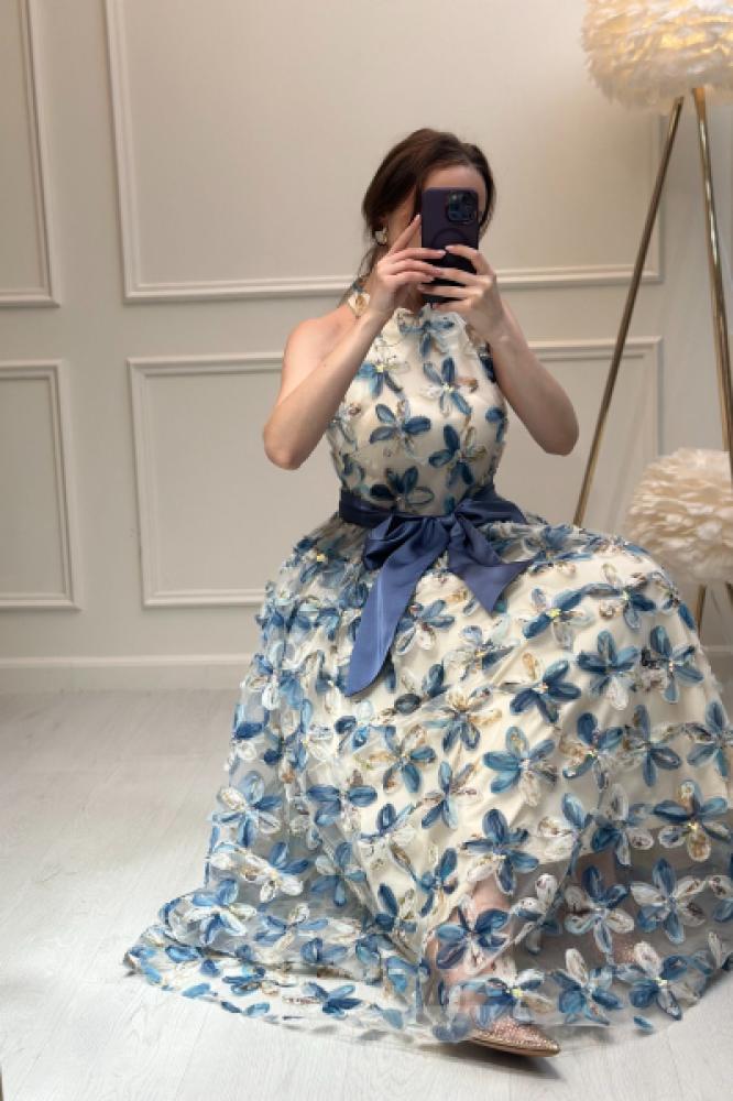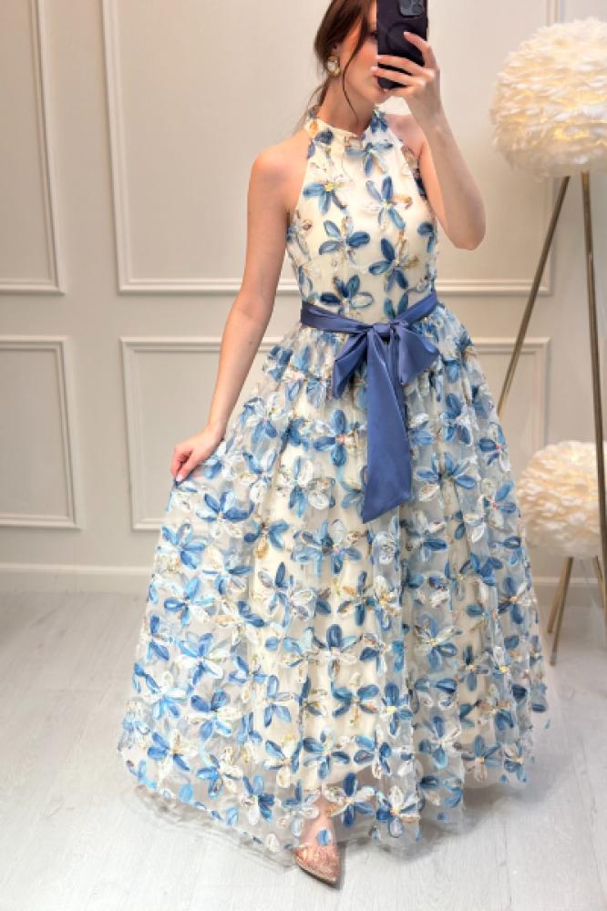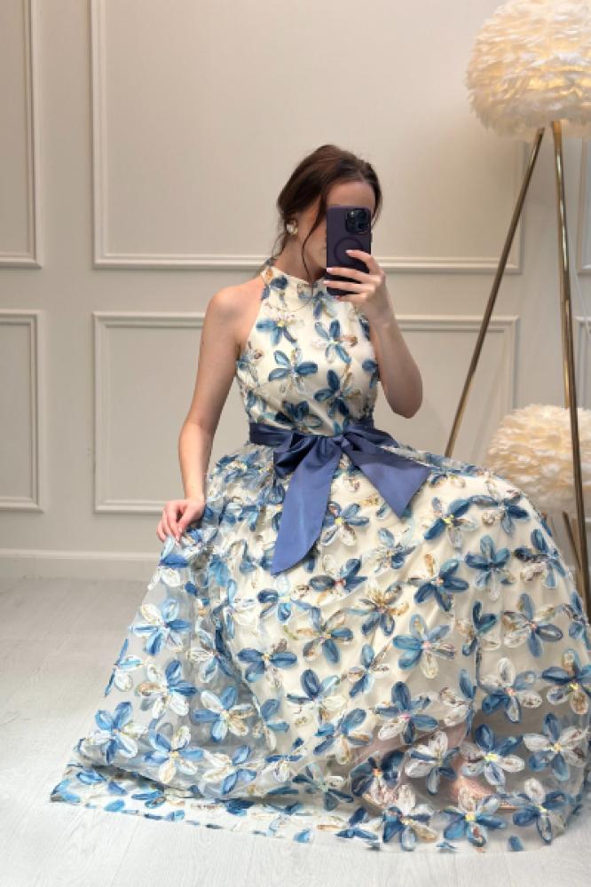 فستان طويل أنيق بتطريز ناعم يزدان بلمسات من الزهور البارزة لمظهر راقٍ ومميز. يتميز بخط عنق خناقي بدون أكمام يمنح إطلالة أنثوية ساحرة، مع حزام قماش يحدد الخصر بأسلوب أنيق. تصميم مثالي لحفلات الخطوبة أو الزواج ليجعلك محط أنظار الجميع.