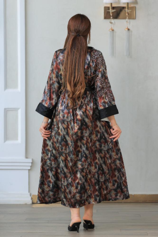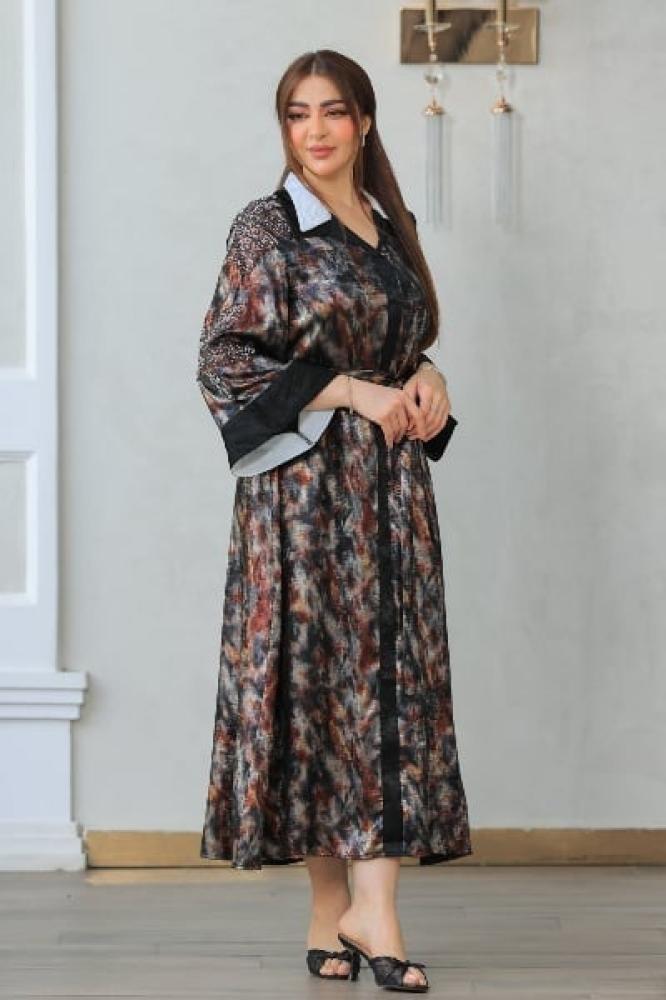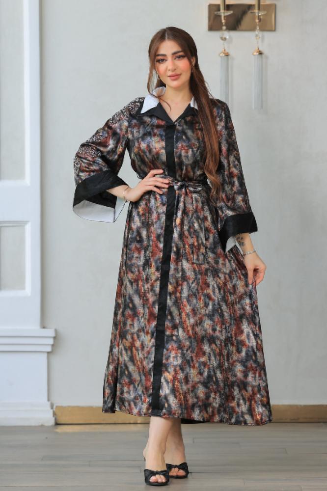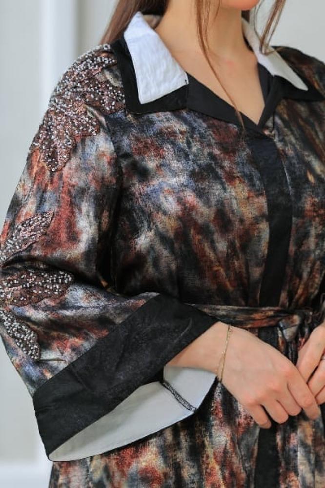 فستان طويل لامع بتصميم عصري يجمع بين الأناقة والتميز. يتميز بياقة قميص بيضاء تمنحه لمسة كلاسيكية راقية، وأكمام مطرزة تضيف جاذبية خاصة. يأتي مع حزام قماش بنفس النقشة لتحديد الخصر وإبراز القوام بشكل أنثوي أنيق. مناسب للخروج اليومي أو المناسبات البسيطة.