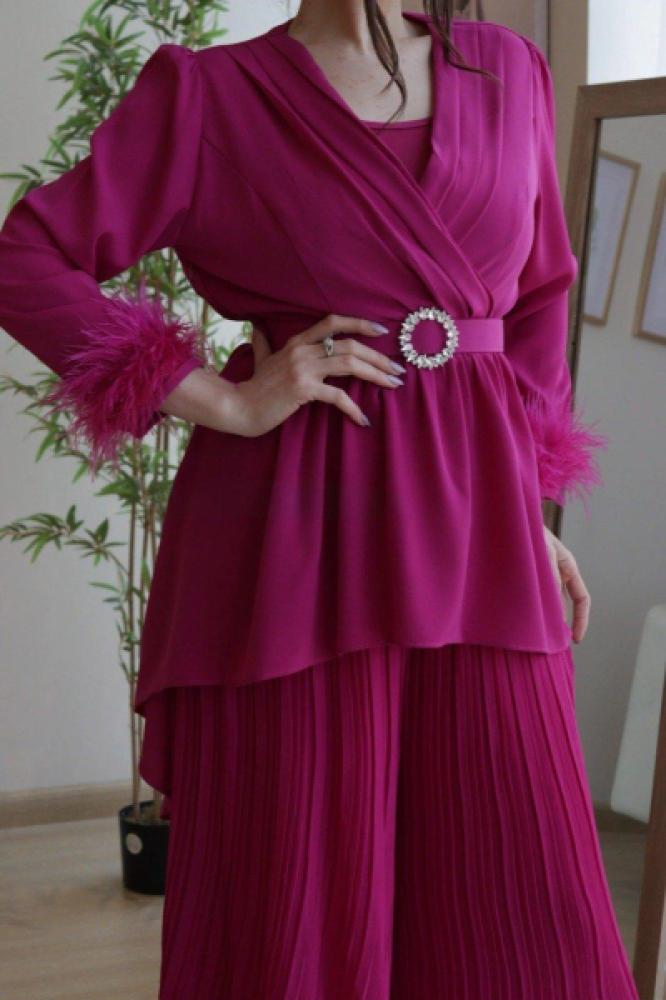 أفرول شيفون واسع بأكمام ريش وحزام كريستال – أناقة تخطف الأنظار
