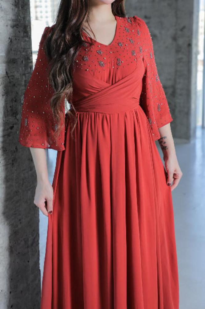 تألقي بإطلالة فخمة مع هذا الفستان الطويل المصنوع من الشيفون الناعم، والمزين بتفاصيل فصوص لامعة تضيف لمسة من السحر والرقي. تصميم كلاسيكي بخط عنق دائري وأكمام طويلة يضفي أناقة خالدة على مظهرك في المناسبات الخاصة.