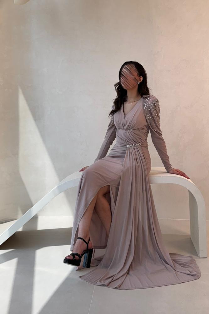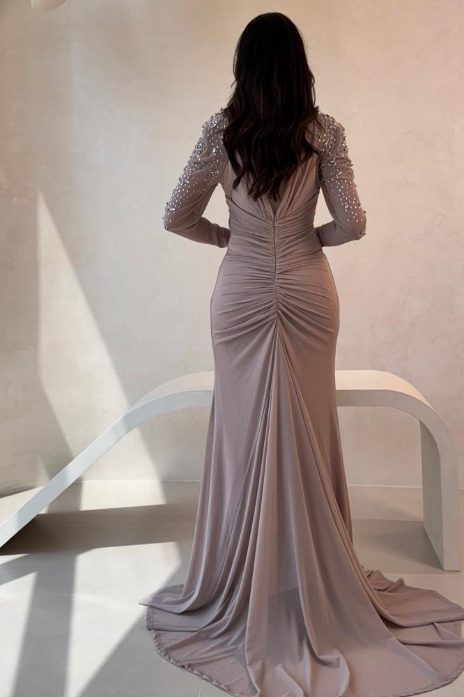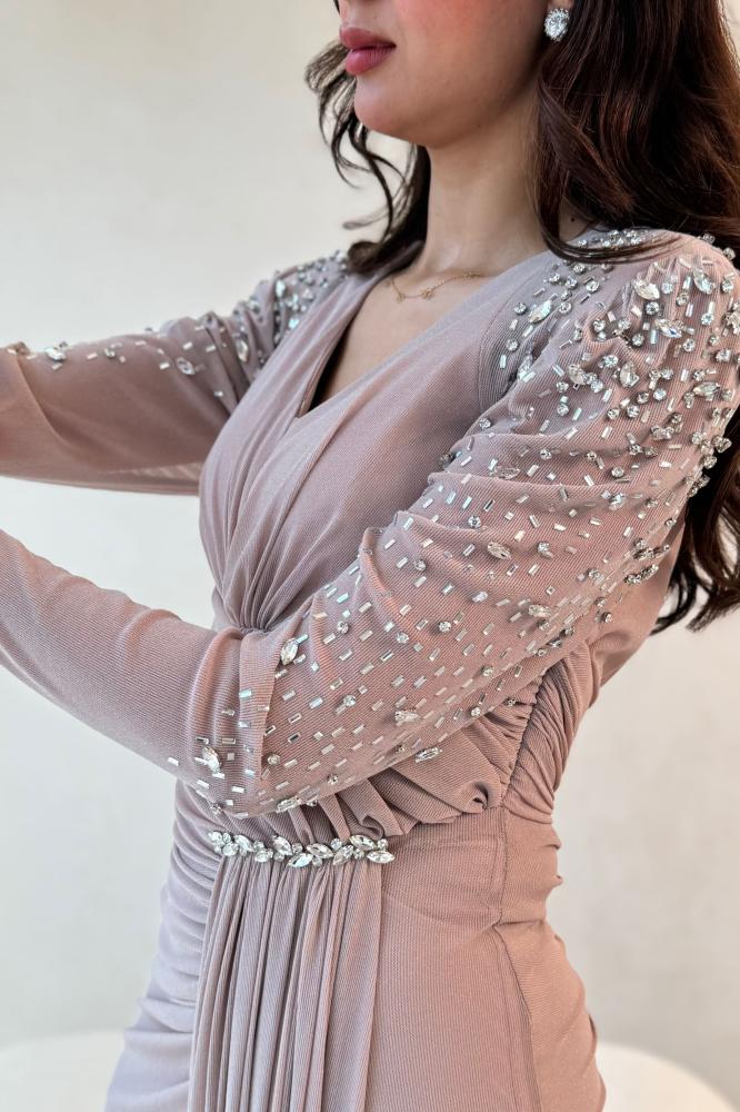 فستان سهرة لحمي فاتح مطرز بكم طويل مع كسرات أنيقة