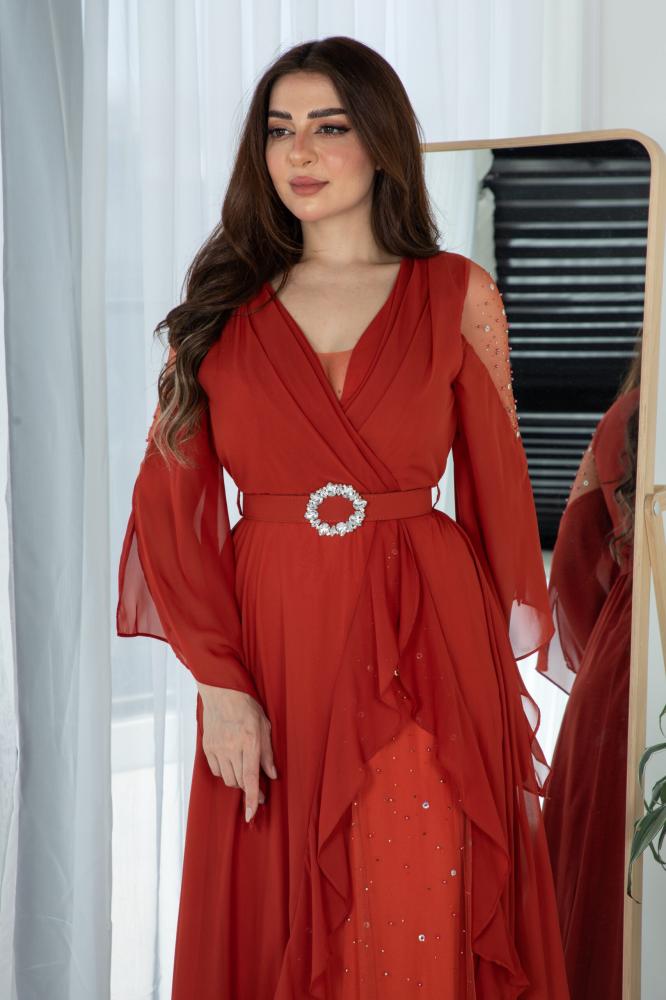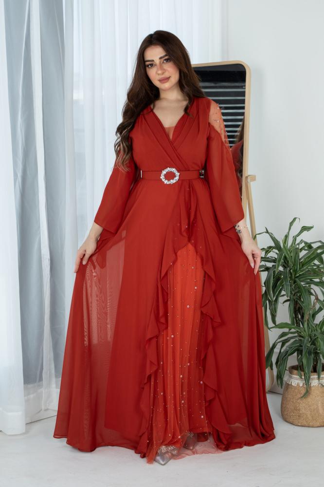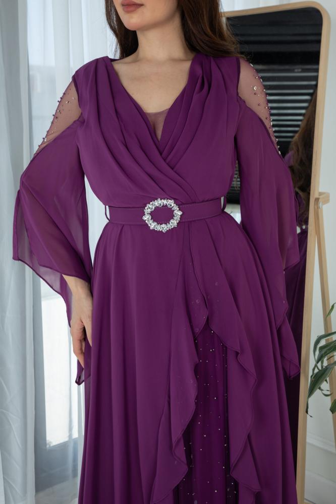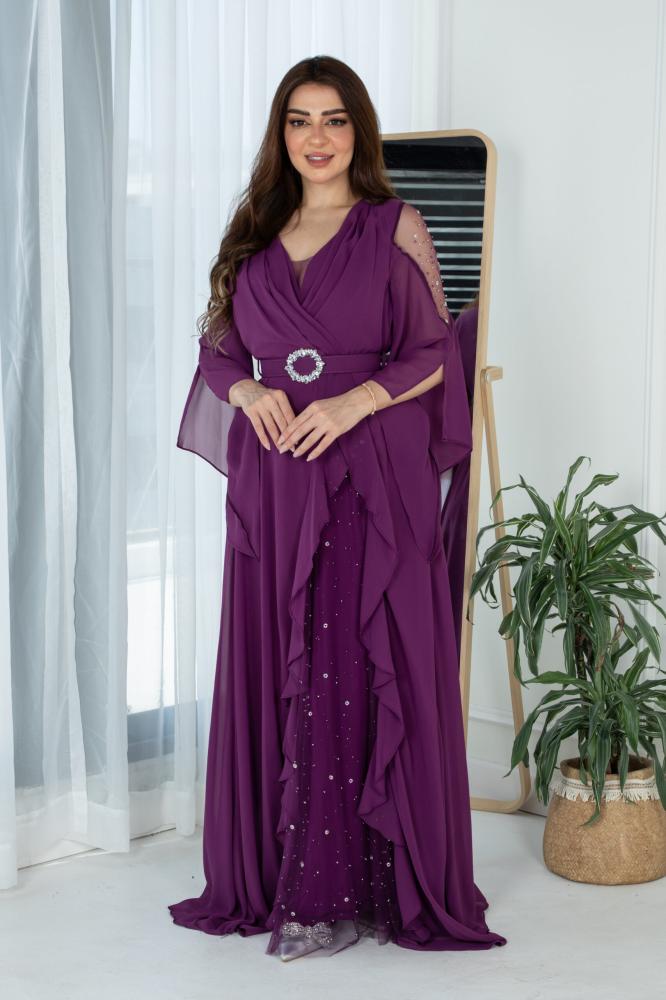 فستان أنيق بتصميم فاخر مصنوع من قماش الشيفون الناعم، يتميز بكتف شفاف وأكمام واسعة تضيف لمسة من الانسيابية، مع كشكش جانبي يبرز جمال التصميم. مزود بتفاصيل براقة أنثوية ليمنحك إطلالة فخمة تناسب المناسبات الخاصة.