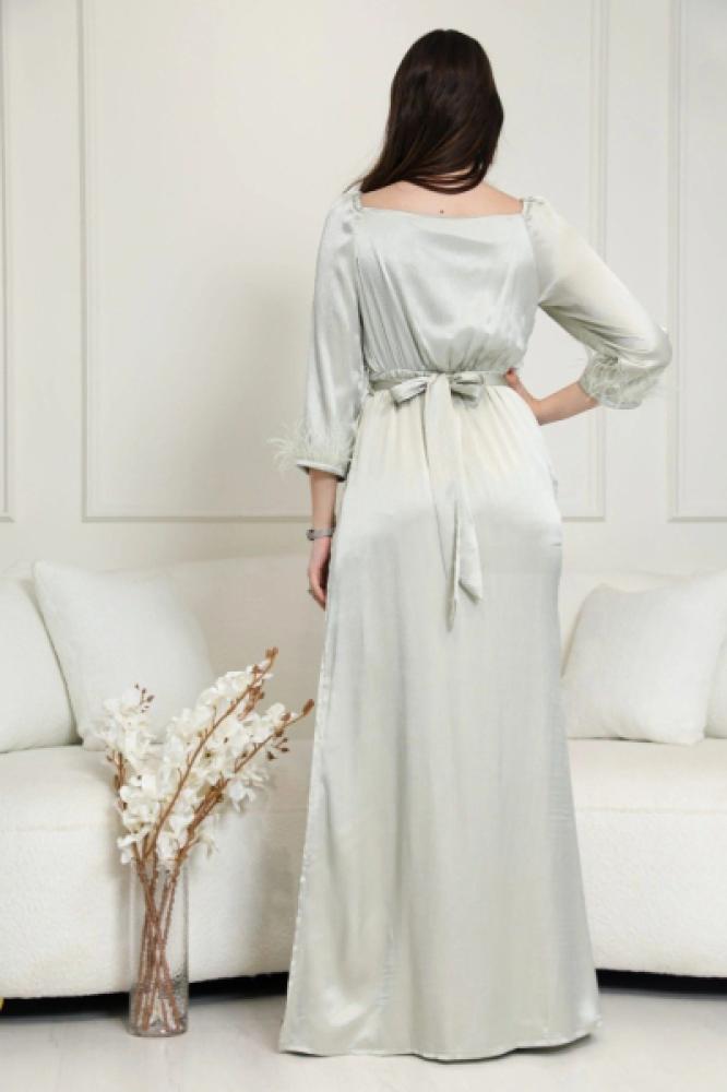 تألقي في مناسباتك الخاصة مع هذا الفستان الفاخر المصنوع من قماش الساتان اللامع، بتصميم راقي مزين بفصوص ناعمة تضيف لمسة بريق أنثوية. يتميز بأكمام طويلة مزينة بالريش لمظهر فخم وحزام قماش يبرز جمال الخصر. مناسب للسهرات والمناسبات الراقية.