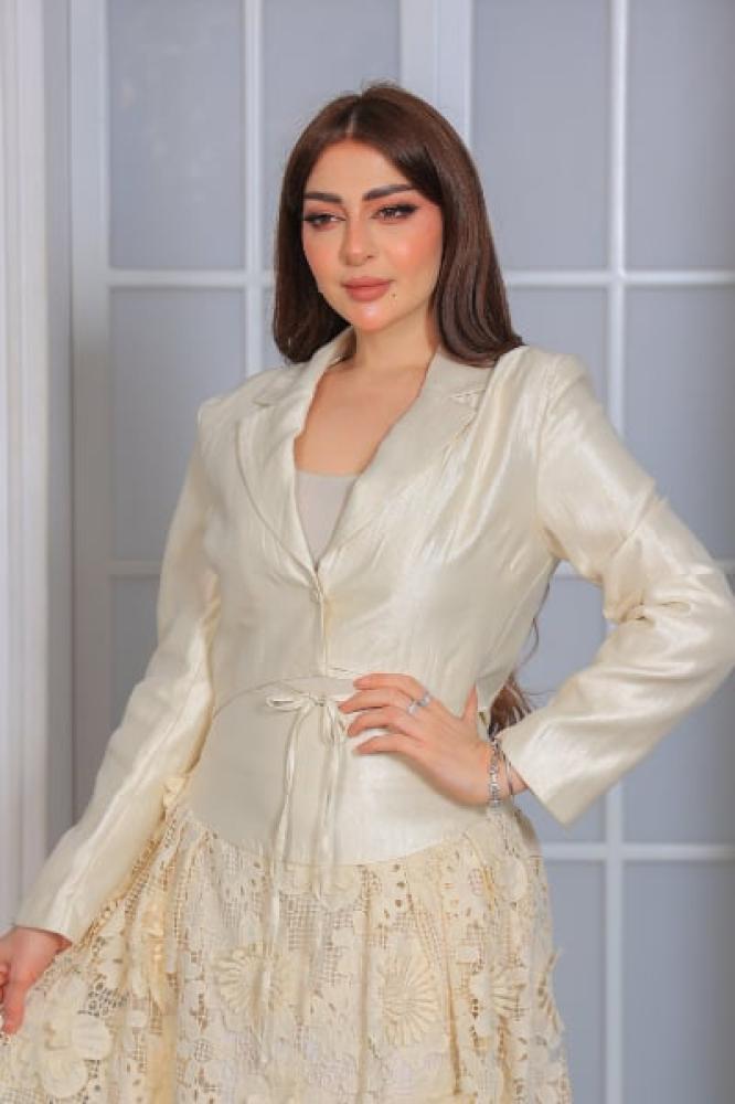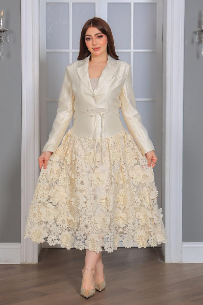 طقم أنيق وراقي يجمع بين الفخامة والأنوثة، يتكون من بلوزة ساتان ناعمة بتصميم عصري مع ياقة بشكل V وأكمام طويلة، وتنورة دانتيل مزينة بزهور بارزة تضفي لمسة فاخرة ومميزة. خيار مثالي لإطلالة راقية في المناسبات الخاصة.